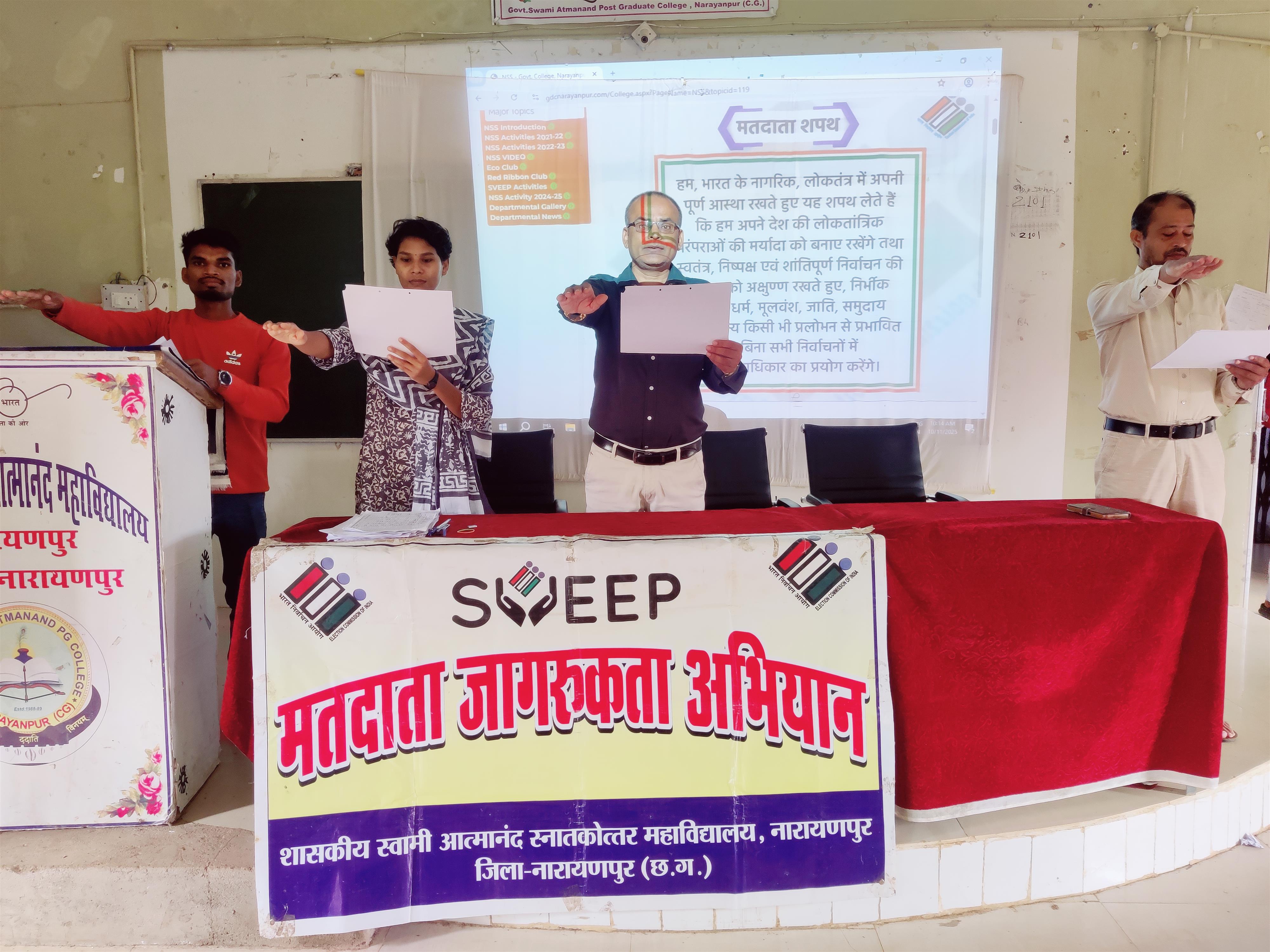 शासकीय स्वामी आत्मानंद स्नातकोत्तर महाविद्यालय नारायणपुर के स्वीप प्रो. नोडल अधिकारी श्री बी. डी. चांडक ने जानकारी दी कि भारत निर्वाचन आयोग एवं मुख्य निर्वाचन पदाधिकारी के निर्देशानुसार आगामी 25 जनवरी 2025 को 15 वां राष्ट्रीय मतदाता दिवस पूरे जिले में धूमधाम से मनाया जाएगा। इस वर्ष की थीम "वोट जैसा कुछ नहीं, वोट जरूर डालेंगे हम" ("Nothing like voting, I vote for sure"), है जिसके तहत व्यापक जागरूकता और कार्यक्रम आयोजित किए जाएंगे। उन्होंने बताया कि इस अवसर पर सभी स्कूलों, कॉलेजों, प्रशिक्षण संस्थानों, पर विशेष कार्यक्रम आयोजित किए जाएंगे। इन कार्यक्रमों के दौरान उपस्थित सभी लोगों को मतदाता शपथ दिलाई जाएगी। शपथ की सामग्री पहले से सोशल मीडिया और व्हाट्सएप ग्रुप्स पर साझा की जाएगी। जिला निर्वाचन अधिकारी कलेक्टर सुश्री प्रतिष्ठा ममगाई पहली बार मतदाता सूची में शामिल नए मतदाताओं को सम्मानपूर्वक मतदाता पहचान पत्र (EPIC) वितरित किए जाएंगे। साथ ही साथ उत्कृष्ट कार्य करने वाले प्रोफेसर स्वीप नोडल अधिकारी एवं बूथ लेवल ऑफिसर को पुरस्कार राशि सह प्रशस्ति पत्र पत्र प्रदान किया जाएगा बूथ लेवल ऑफिसर्स (BLO) अपने-अपने क्षेत्रों में कार्यक्रम आयोजित कर नए मतदाताओं का स्वागत करेंगे और उन्हें मतदान के महत्व के प्रति जागरूक करेंगे। जिला मुख्यालय में आयोजित होने वाले मुख्य कार्यक्रम में पंचायत राज संस्थाओं,सिविल सोसाइटी संगठनों,एनएसएस,एनसीसी,स्काउट्स और गाइड्स,युवा स्वयंसेवक संगठनों,और मीडिया का सहयोग लिया जाएगा। इस कार्यक्रम में मतदान प्रक्रिया, ईवीएम-वीवीपेट का प्रदर्शन, नैतिक मतदान और अन्य जागरूकता गतिविधियां शामिल की जाएंगी। जिले के सभी शिक्षण संस्थानों में रंगोली वाद-विवाद, प्रश्नोत्तरी, निबंध लेखन, चित्रकला, गीत,नाटक और स्लोगन लेखन जैसी प्रतियोगिताएं आयोजित की जाएंगी। इन गतिविधियों के माध्यम से युवाओं को मतदान के महत्व के प्रति जागरूक किया जाएगा। राष्ट्रीय मतदाता दिवस के प्रचार-प्रसार के लिए प्रिंट मीडिया, टीवी, रेडियो, सोशल मीडिया और फील्ड कार्यक्रमों का व्यापक उपयोग किया जाएगा सोशल मीडिया प्लेटफॉर्म्स पर NVD2025 और NothingLikeVoting हैशटैग का उपयोग कर नारायणपुर जिले में आयोजित सभी गतिविधियों की तस्वीरें और वीडियो साझा की जाएंगी। कार्यक्रम का मुख्य उद्देश्य लोकतंत्र को सशक्त बनाना, मतदान के प्रति जागरूकता बढ़ाना और नए मतदाताओं को प्रेरित करना है। जिला निर्वाचन अधिकारी ने सभी विभागों, संस्थानों और नागरिकों से इस कार्यक्रम में सक्रिय भागीदारी की अपील करते हुए कहा कि सभी गतिविधियों की फोटोग्राफ्स और वीडियो समय पर निर्वाचन कार्यालय से साझा की जाएं।