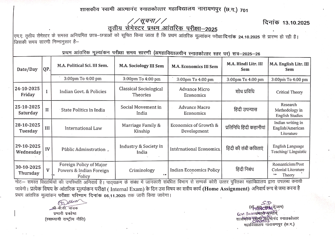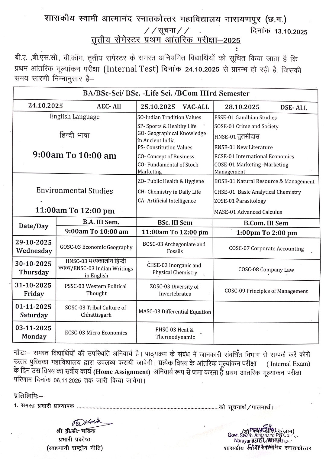 SEP 25 2025 BA/BSc/BCom अनियमित विद्यार्थियों की प्रथम सेमेस्टर आंतरिक मूल्यांकन परीक्षा समय सारणी 2025