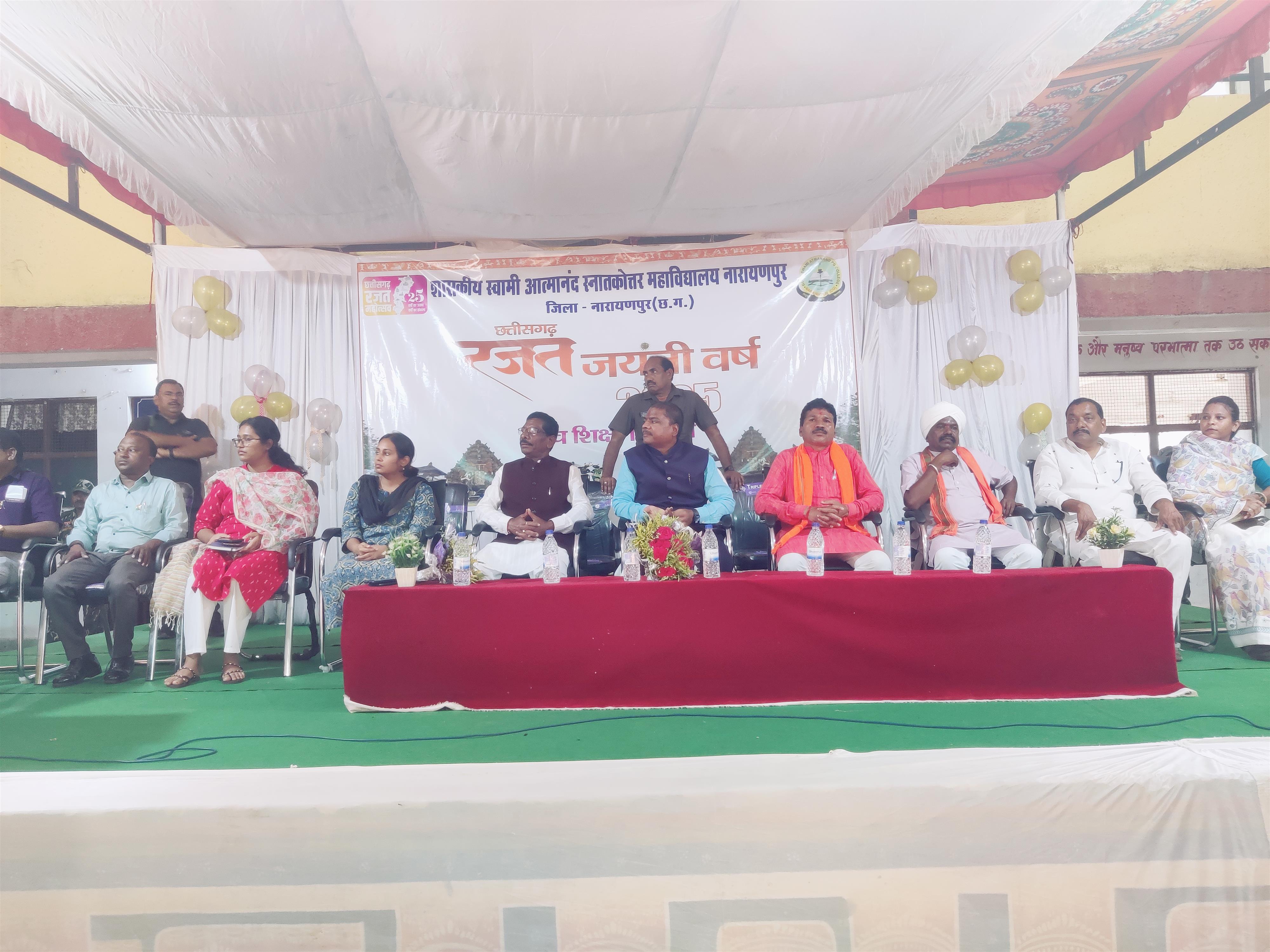 छत्तीसगढ़ राज्य स्थापना के 25 वर्ष पूर्ण होने के उपलक्ष में शासन द्वारा आयोजित रजत जयंती समारोह की शुरुआत शनिवार को शासकीय स्वामी आत्मानंद स्नातकोत्तर महाविद्यालय नारायणपुर में हुई इस अवसर पर वन एवं जलवायु परिवर्तन मंत्री श्री केदार कश्यप मुख्य अतिथि के रूप में उपस्थित हुए उन्होंने दीप प्रज्ज्वलन कर कार्यक्रम का शुभारंभ किया और विद्यार्थियों को जीवन में लक्ष्य निर्धारित कर धैर्य और कठिन परिश्रम के साथ उसे प्राप्त करने की प्रेरणा दी साथ ही मंत्री जी ने विद्यार्थियों की मांग पर डिजिटल और इलेक्ट्रॉनिक संसाधनों से युक्त लाइब्रेरी स्थापित करने की घोषणा की उन्होंने कहा कि लाइब्रेरी में अत्यधिक आधुनिक फर्नीचर और अन्य आवश्यक उपकरण भी उपलब्ध कराए जाएंगे ताकि छात्र-छात्राओं को गुणवत्तापूर्ण शैक्षणिक सुविधा मिल सके। कार्यक्रम की अध्यक्षता कर रहे हैं महाविद्यालय के प्राचार्य डॉ. एस. आर. कुंजाम ने शैक्षणिक और सामाजिक उपलब्धियां को विस्तार से उल्लेख किया। महाविद्यालय के वरिष्ठ प्राध्यापक श्री बी. डी. चांडक ने रजत जयंती उत्सव के अवसर पर विभिन्न गतिविधियों - पुस्तक प्रदर्शनी, क्विज प्रतियोगिता, रंगोली, पोस्टर, भाषण एवं सांस्कृतिक कार्यक्रम का आयोजन अलग-अलग तिथियां में किए जाएंगे जनभागीदारी समिति के अध्यक्ष श्री नरेंद्र मेश्राम ने इस अवसर पर महाविद्यालय के शिक्षकों को साल एवं श्रीफल भेंट कर सम्मानित किया उन्होंने कहा कि शिक्षकों के परिश्रम और विद्यार्थियों की लगन से ही महाविद्यालय निरंतर प्रगति कर रहा है। इस कार्यक्रम के दौरान जिला कलेक्टर सुश्री प्रतिष्ठा ममगाई, जिला पंचायत अधिकारी डॉ. आकांक्षा शिक्षा खलको एवं अन्य अधिकारी, कर्मचारी बड़ी संख्या में छात्र-छात्राओं की उपस्थित हुई।