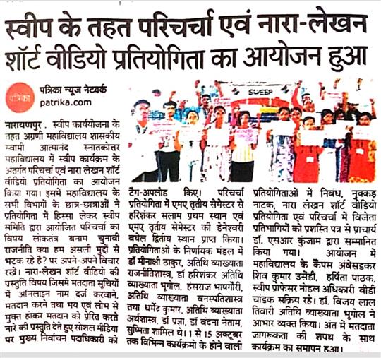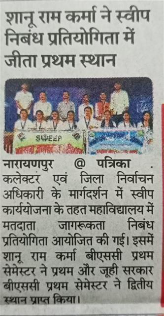 शासकीय स्वामी आत्मानंद स्नातकोत्तर महाविद्यालय नारायणपुर के स्वीप प्रो. नोडल अधिकारी श्री बी. डी. चांडक ने जानकारी दी कि भारत निर्वाचन आयोग एवं मुख्य निर्वाचन पदाधिकारी के निर्देशानुसार आगामी 25 जनवरी 2025 को 15 वां राष्ट्रीय मतदाता दिवस पूरे जिले में धूमधाम से मनाया जाएगा। इस वर्ष की थीम "वोट जैसा कुछ नहीं, वोट जरूर डालेंगे हम" ("Nothing like voting, I vote for sure"), है जिसके तहत व्यापक जागरूकता और कार्यक्रम आयोजित किए जाएंगे। उन्होंने बताया कि इस अवसर पर सभी स्कूलों, कॉलेजों, प्रशिक्षण संस्थानों, पर विशेष कार्यक्रम आयोजित किए जाएंगे। इन कार्यक्रमों के दौरान उपस्थित सभी लोगों को मतदाता शपथ दिलाई जाएगी। शपथ की सामग्री पहले से सोशल मीडिया और व्हाट्सएप ग्रुप्स पर साझा की जाएगी। जिला निर्वाचन अधिकारी कलेक्टर सुश्री प्रतिष्ठा ममगाई पहली बार मतदाता सूची में शामिल नए मतदाताओं को सम्मानपूर्वक मतदाता पहचान पत्र (EPIC) वितरित किए जाएंगे। साथ ही साथ उत्कृष्ट कार्य करने वाले प्रोफेसर स्वीप नोडल अधिकारी एवं बूथ लेवल ऑफिसर को पुरस्कार राशि सह प्रशस्ति पत्र पत्र प्रदान किया जाएगा बूथ लेवल ऑफिसर्स (BLO) अपने-अपने क्षेत्रों में कार्यक्रम आयोजित कर नए मतदाताओं का स्वागत करेंगे और उन्हें मतदान के महत्व के प्रति जागरूक करेंगे। जिला मुख्यालय में आयोजित होने वाले मुख्य कार्यक्रम में पंचायत राज संस्थाओं,सिविल सोसाइटी संगठनों,एनएसएस,एनसीसी,स्काउट्स और गाइड्स,युवा स्वयंसेवक संगठनों,और मीडिया का सहयोग लिया जाएगा। इस कार्यक्रम में मतदान प्रक्रिया, ईवीएम-वीवीपेट का प्रदर्शन, नैतिक मतदान और अन्य जागरूकता गतिविधियां शामिल की जाएंगी। जिले के सभी शिक्षण संस्थानों में रंगोली वाद-विवाद, प्रश्नोत्तरी, निबंध लेखन, चित्रकला, गीत,नाटक और स्लोगन लेखन जैसी प्रतियोगिताएं आयोजित की जाएंगी। इन गतिविधियों के माध्यम से युवाओं को मतदान के महत्व के प्रति जागरूक किया जाएगा। राष्ट्रीय मतदाता दिवस के प्रचार-प्रसार के लिए प्रिंट मीडिया, टीवी, रेडियो, सोशल मीडिया और फील्ड कार्यक्रमों का व्यापक उपयोग किया जाएगा सोशल मीडिया प्लेटफॉर्म्स पर NVD2025 और NothingLikeVoting हैशटैग का उपयोग कर नारायणपुर जिले में आयोजित सभी गतिविधियों की तस्वीरें और वीडियो साझा की जाएंगी। कार्यक्रम का मुख्य उद्देश्य लोकतंत्र को सशक्त बनाना, मतदान के प्रति जागरूकता बढ़ाना और नए मतदाताओं को प्रेरित करना है। जिला निर्वाचन अधिकारी ने सभी विभागों, संस्थानों और नागरिकों से इस कार्यक्रम में सक्रिय भागीदारी की अपील करते हुए कहा कि सभी गतिविधियों की फोटोग्राफ्स और वीडियो समय पर निर्वाचन कार्यालय से साझा की जाएं।